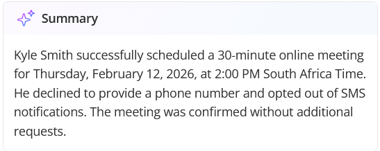 - Transcript Summary: A high level summary of the call’s outcome, including its success status and details on scheduling results or messages left.