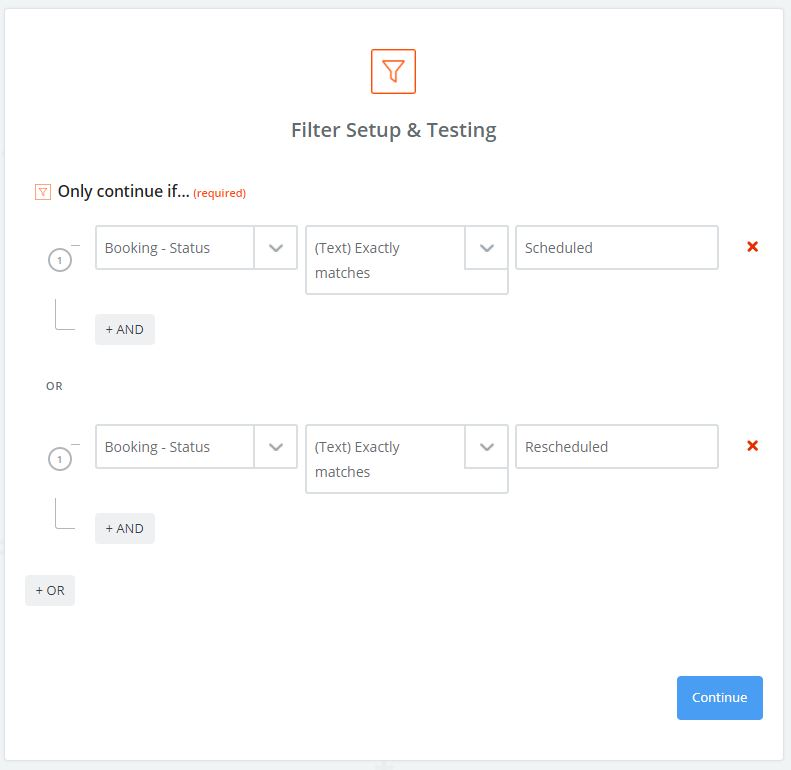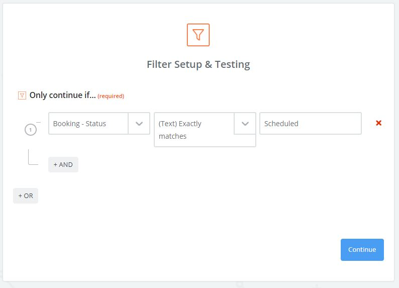A Filter is an optional step in a Zap that allows you to control when a Zap is triggered. You can define rules that state whether the Zap Action should be performed. For example, if you have multiple Booking pages, you can define a filter that states the Zap should only be triggered on specific Booking pages. Another option is to create filters that state the Zap should only be triggered upon specific booking events (e.g. Scheduled and Rescheduled).